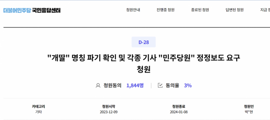 앞서 이재명 민주당 대표 팬카페 '재명이네 마을' 개설자를 자칭하는 인물이 민주당 국민응답센터에 글을 올려 개딸 명칭을 공식 파기해야 한다고 주장했다. 지난 9일부터 시작한 이 청원은 10일 현재 1800명 이상의 동의를 받았다.