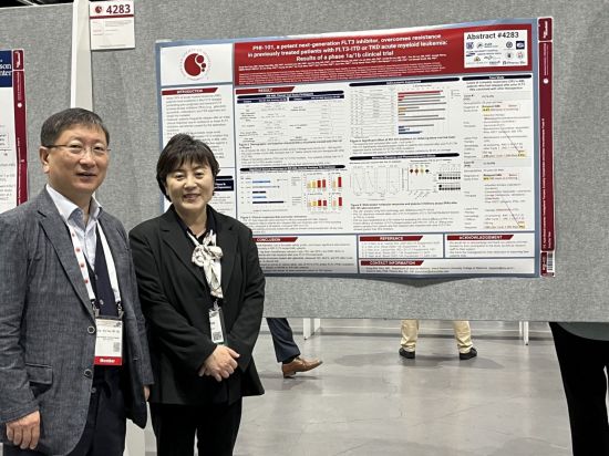 한혜정 파로스아이바이오 미국법인 대표(오른쪽)와 윤성수 서울대병원 혈액종양내과 교수가 미국혈액학회에 참가해 ‘PHI-101’의 임상 1a, b상 연구 결과를 발표한 뒤 사진을 촬영하고 있다. [사진제공=파로스아이바이오]