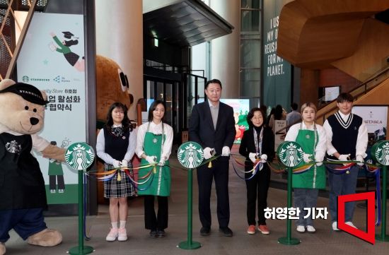 스타벅스 코리아는 종로R점을 커뮤니티 스토어로 전환하며 9일 JA 코리아와 청년 취업 활성화를 위한 업무협약을 체결했다. 커뮤니티 스토어는 스타벅스 코리아가 매장 수익금 일부를 지역사회에 환원하는 이익공유형 매장이다. 손정현 스타벅스코리아 대표(가운데)와 이은형 JA 코리아 회장이 파트너 및 예비 파트너인 고교생들과 테이프 커팅을 하고 있다.