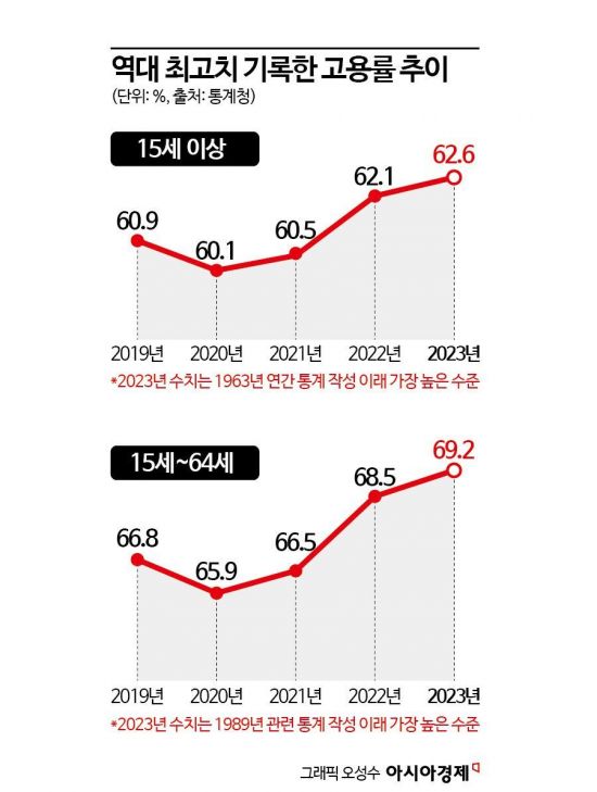 통계청이 10일 발표한 ‘2023년 연간 고용동향’에 따르면 지난해 15~64세 고용률(경제협력개발기구(OECD) 기준)은 69.2%로 1989년 관련 통계를 작성한 이후 가장 높은 수준을 기록했다. 15세 이상 고용률도 62.6%로 1963년 연간 통계 작성 이래 가장 높았다. 전체 실업률은 2.7%로 전년보다 0.2%포인트 하락했다. 실업률은 2021년 3.7%, 2022년 2.9%보다 줄어들면서 양호한 고용 흐름을 이어갔다.