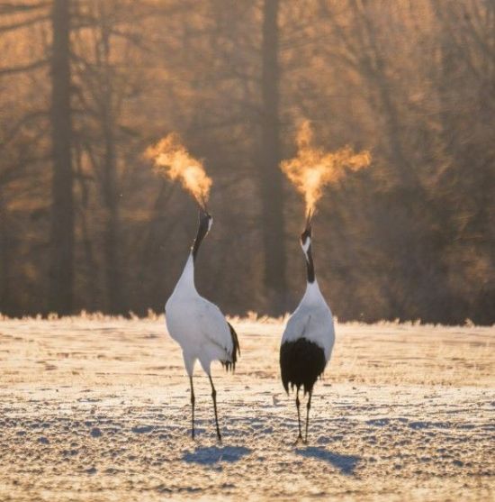 일출 시각과 절묘하게 맞아떨어져 두루미들이 불꽃을 내뿜고 있는 것처럼 포착된 사진이 일본 누리꾼 사이에서 화제다. 촬영된 사진을 보면 두루미 두 마리가 하얗게 눈이 쌓인 땅 위에 꼿꼿하게 서서 하늘을 향해 주황색 입김을 내뿜고 있다. 흰 입김이 햇빛을 받아 주황색으로 물든 것이다. 두루미들이 마치 부리로 불꽃을 내뿜는 것처럼 보인다.