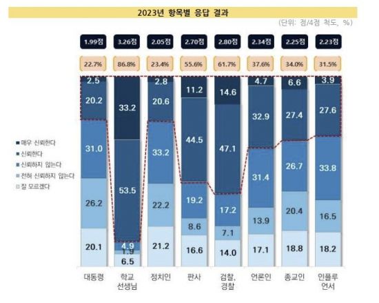 4점 척도로 신뢰도를 매겨달라는 질문에서도 '학교 선생님'이 3.26점으로 가장 높았고, '대통령'이 1.99점으로 최저를 기록했다. '정치인'은 2.05점으로 대통령 다음으로 낮았으며, '인플루언서'의 신뢰도는 2.23점으로 정치인·대통령보다 높았다.