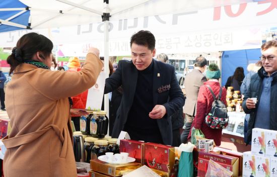 오언석 도봉구청장이 지난 1월 31일 도봉구청 전면광장에서 열린 ‘설맞이 농축수산물 직거래장터’를 찾아 지역특산물을 구매하고 상인들과 인사를 나눴다.