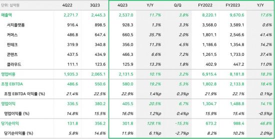 사업 부문별로 보면 검색·디스플레이 광고가 포함된 서치플랫폼 매출이 3조5891억원을 기록했다. 전년 대비 0.6% 늘어나는 것에 그쳤다. 경기 불황 여파로 디스플레이 광고 매출이 주춤했다. 다만 검색 광고는 모바일 통합 검색을 개편하고 광고 상품 사용자환경(UI)을 개선하면서 성장세를 이어갔다. 네이버는 생성형 인공지능(AI) 검색 서비스 '큐:(Cue:)'를 지난 11월 말 PC 통합검색에 적용한 데 이어 올해 모바일로 테스트를 확장할 계획이다.