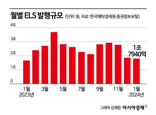 7일 한국예탁결제원 증권정보포털(세이브로)에 따르면 올해 1월 ELS 발행금액은 1조7940억원을 기록하며 감소세를 지속했다. ELS 발행금액은 지난해 4월 3조6000억원대를 기록한 이후 지속해서 줄어드는 추세다. 지난해 9~10월 잠시 증가세를 나타내기도 했으나 11월 다시 감소세로 돌아섰고 12월에는 2조원 아래로 떨어졌다.