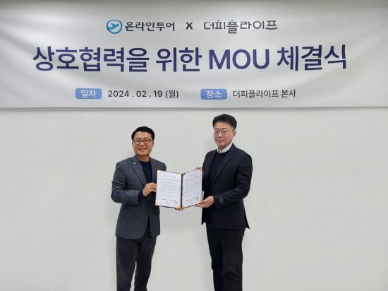 더피플라이프(대표 차성곤,김명곤)는 지난 19일 온라인투어(대표 박혜원)와 멤버십 할인 혜택 및 제휴상품 출시를 위한 MOU협약식을 체결했다.