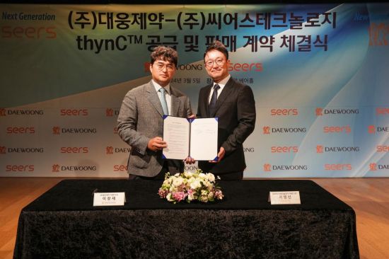 대웅제약은 5일 서울 강남구 대웅제약 본사에서 씨어스테크놀로지와 실시간 입원환자 모니터링 솔루션 씽크(thynCTM)의 국내 공급을 위한 계약을 체결했다고 6일 밝혔다. 대웅제약은 국내 유통과 사후관리(A/S)를, 씨어스는 제조?생산 및 기술지원을 맡는다.