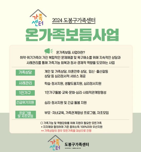 도봉구(구청장 오언석) 도봉구가족센터(센터장 강진아)가 올해부터 개별적으로 운영되던 가족 지원 서비스를 ‘온가족보듬사업’으로 통합하고 새롭게 운영한다고 밝혔다.