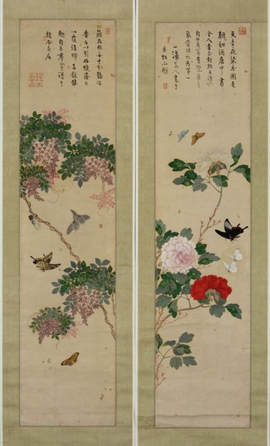 남계우가 두 폭 족자에 남긴 '꽃과 나비' 작품은 그림을 배울 때 쓰는 교재를 보면서 화면 구도와 나비 동작 등을 익힌 것으로, 섬세한 관찰력이 돋보인다.