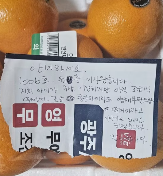 A씨가 올린 사진을 보면, 선물로 보낸 오렌지 위에 광고 전단지 귀퉁이를 찢어 쓴 쪽지가 보인다. 쪽지에는 간단한 인사말과 함께 "1006호 위층에 이사 왔다"라며 "저희 아이가 9살이긴 하지만 아직 조금씩 뛰어서, 조금 쿵쿵거리더라도 양해 부탁드린다. 뛰지 말라고 이야기는 매번 하겠다"고 적혀있다.