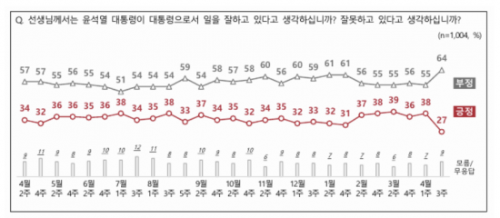 직전 조사인 2주 전 조사보다 긍정 평가는 11%포인트 내렸고, 부정 평가는 9%포인트 올랐다. 윤 대통령은 설 이후 30%대 중후반을 오가는 지지율 흐름세를 보였지만, 총선을 거치면서 급락한 모양새다.