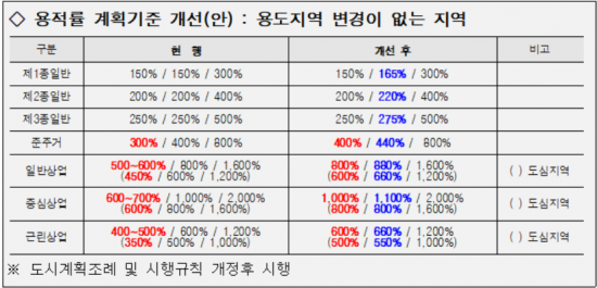 지구단위계획구역에서 인위적으로 낮게 설정했던 기준용적률 하향 규정도 폐지된다. 기준용적률은 조례용적률과 동일하게 적용된다. 준주거지역 기준용적률은 300%에서 400%로 바뀐다. 일반상업지역은 500~600%에서 800%로, 중심상업지역은 600~700%에서 1000%로 개선된다.