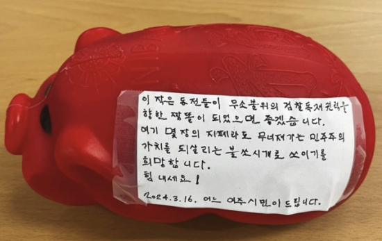 조국 조국혁신당 대표가 지지자가 보낸 '돼지저금통' 사진을 소개하며 특별당비 납부 사실을 공개했다.