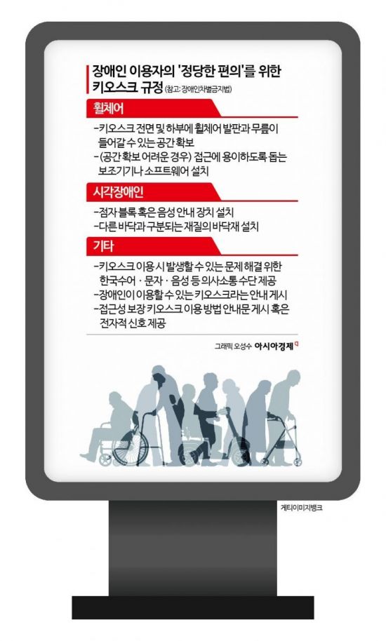 지난해 ‘장애인차별금지 및 권리구제 등에 관한 법률(장애인차별금지법)’이 개정되면서 올해 1월28일부터 ‘접근성 보장 키오스크’ 설치 의무화가 단계별로 시작됐다. 재화·용역 등의 제공자는 단계별 시행일에 맞춰 장애 유무에 구애받지 않고 모든 사람이 동등하게 접근하고 이용할 수 있도록 편의를 제공해야 한다. 만약 장애인 이용자가 키오스크 이용에 차별을 느껴 이에 대해 진정을 제기할 경우 최대 3000만원의 과태료가 부과될 수 있다.