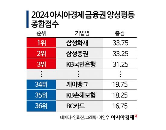 금융기업 36곳을 대상으로 한 '2024 아시아경제 양성평등 종합점수' 1위는 삼성화재해상보험이 차지했다. 삼성화재는 33.75점을 획득해 1위에 올랐다. 최하위는 BC카드(16.75점)였다.