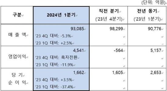 2024년 1분기 매출액은 9조 3085억원을 기록했고, 영업이익은 4541억원을 기록하며 전 분기 대비 흑자 전환함.