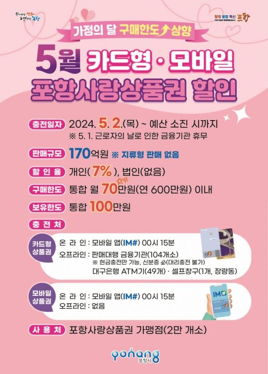 포항시는 가정의 달을 맞아 내달 2일 포항사랑카드·모바일 포항사랑상품권 170억원을 발행해 5월 상시 7% 할인판매를 시작하고, 개인 구매한도액과 보유한도액을 상향한다.