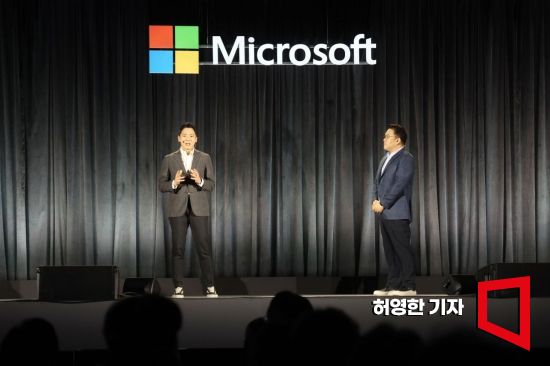 30일 서울 aT센터에서 열린'마이크로소프트 AI 투어'의 키노트 세션에서 조원우 한국마이크로소프트 대표(오른쪽)와 우정훈 LG전자 상무가 주제 발표를 하고 있다. 사진=허영한 기자 younghan@