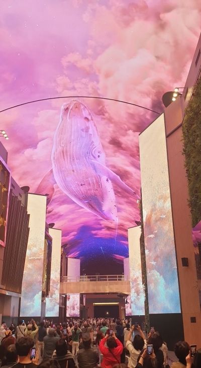 2일 방문한 인천 영종도의 모히건 인스파이어 엔터테인먼트리조트. 오후 1시가 임박하자 남녀노소를 불문하고 방문객 수백명이 디지털 엔터테인먼트 거리로 불리는 '오로라'에 몰려들었다. 매시 정각과 30분에 맞춰 선보이는 디지털 아트를 관람하기 위해서다. 길이 150m, 높이 25m에 달하는 천장과 벽면을 따라 조성한 LED 스크린에서는 약 3분간 물고기와 가오리, 해파리 등 해양 생물이 유영하는 모습을 디지털 영상으로 보여준다. 콘텐츠의 하이라이트인 핑크 고래가 거대한 몸집을 드러내며 화면을 채우자 휴대전화 카메라를 움직이던 관람객들이 일제히 "우와"하며 탄성을 쏟아냈다.