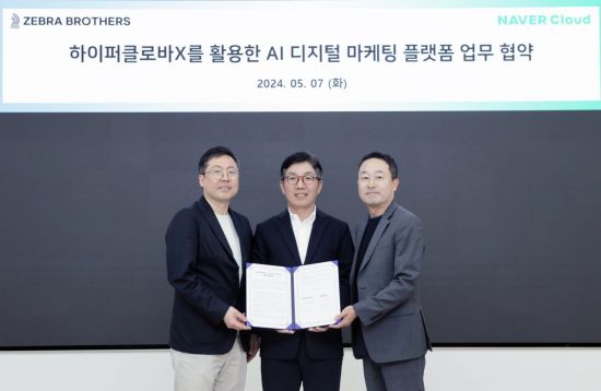 [지브라브라더스와 네이버클라우드가 5월 7일, 네이버 1784에서 인공지능(AI) 기반 디지털 마케팅 서비스 개발을 위한 업무협약(MOU)을 체결했다. 왼쪽부터 지브라브라더스 신희진 대표, 네이버클라우드 김유원 대표, 지브라브라더스 장덕수 대표]