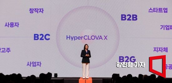 최수연 네이버 대표가 24일 서울 강남구 그랜드인터컨티넨탈 서울파르나스에서 열린 '팀 네이버 콘퍼런스 단23'에서 초거대 인공지능(AI) 서비스를 위한 거대언어모델 '하이퍼 클로바X'를 공개하고 있다. 사진=강진형 기자aymsdream@