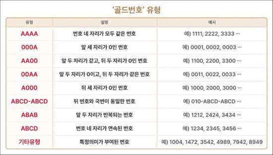 SK텔레콤[017670]이 골드번호 1만개를 추첨으로 나눠주는 행사를 진행한다고 9일 밝혔다. 골드번호는 휴대전화 번호 뒷부분 4자리가 1111, 2200, 3000처럼 특정 패턴이 있거나 ABCD-ABCD 형태처럼 국번(중간번호)과 뒷자리가 같은 번호(예 1234-1234, 5678-5678), 또는 1004(천사), 1472(일사천리)와 같이 특정한 의미를 갖는 번호다.