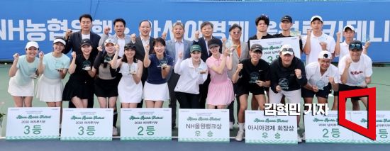 2024 NH농협은행·아시아경제 올원루키테니스페스티벌 2일차 경기가 9일 경기 고양시 농협대학교 테니스코트에서 열렸다. 현상순 아시아경제 회장과 NH농협은행 박병규 수석부행장 등 내빈들이 각 부문 수상자들과 기념촬영을 하고 있다. 사진=김현민 기자 kimhyun81@