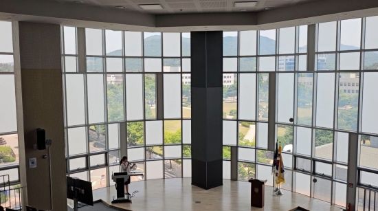 특히 하이브리드 스카이 홀에서는 한기대의 전경을 한눈에 볼 수 있다. 언뜻 보기에는 일반 복층 강의실처럼 보이지만 유리창에 PDLC 필름이 부착돼 있어 전류가 흐르지 않을 때는 불투명한 상태로, 전류가 흐를 때는 투명한 상태로 전환이 가능하다. 프로그래밍 방법에 따라 안쪽에서 바깥쪽으로, 아래쪽에서 위쪽으로, 격자무늬로도 다양하게 활용할 수 있다.