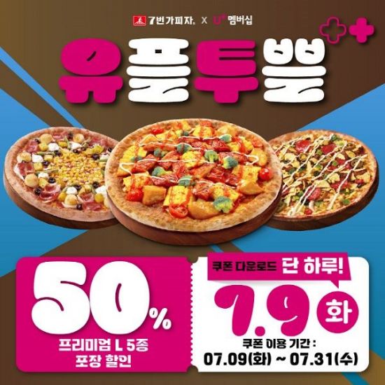 프리미엄 피자브랜드 7번가피자가 LG유플러스의 7월 ‘유플투쁠’ 프로모션에 참여한다고 밝혔다. 프로모션 쿠폰은 7월 9일 오전 11시에 LG유플러스 앱 쿠폰 페이지에서 다운로드 받을 수 있으며 7월 31일까지 이용 가능하다.