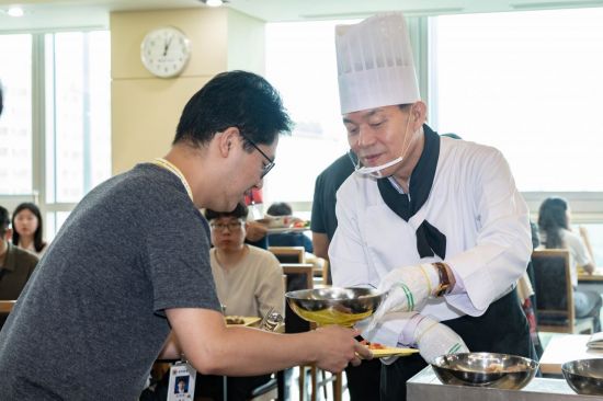 이재준 수원시장이 초복을 맞아 15일 시청 구내식당에서 직원들에게 삼계탕을 배식하고 있다. 이 시장은 배식 후에는 결혼을 앞둔 공직자 4명(2쌍)과 함께 식사를 하며 이야기를 나누고, 결혼축하 기념품을 전달했다. 오찬에는 이재식 수원시의회 의장, 노조위원장 등이 함께 했다.