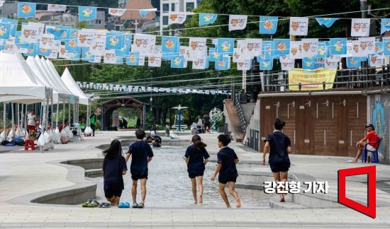 중부지방에 장맛비가 주춤해지며 다시 찜통더위가 찾아온 19일 서울 송파구 성내천 물놀이장을 찾은 시민들이 물놀이를 하며 더위를 식히고 있다.