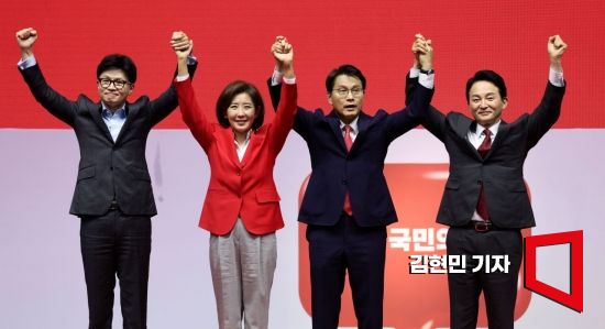 한동훈(왼쪽부터), 나경원, 윤상현, 원희룡 국민의힘 당 대표 후보들이 17일 경기 고양시 고양 소노 아레나에서 열린 제4차 전당대회, 서울 인천 경기 강원 합동연설회에서 손을 들어 인사하고 있다. 사진=김현민 기자 kimhyun81@