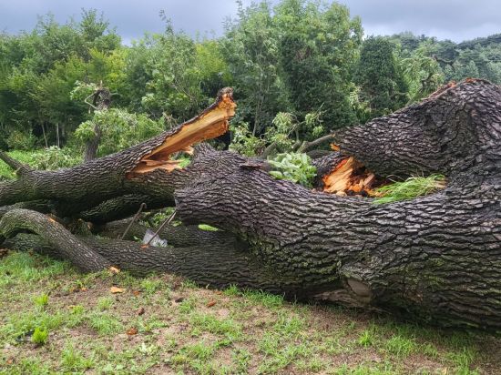 23일 연합뉴스에 따르면 이날 오전 1시께 포천시 관인면 초과리의 오리나무가 강풍과 폭우를 이기지 못해 뿌리째 뽑혀 쓰러져 있다는 신고가 포천시와 소방당국 등에 접수됐다. 포천시가 현장에 도착했을 때 이미 나무는 밑동이 부러진 상태였고, 나무를 지지했던 철근 지지대도 쓰러져 있었다.