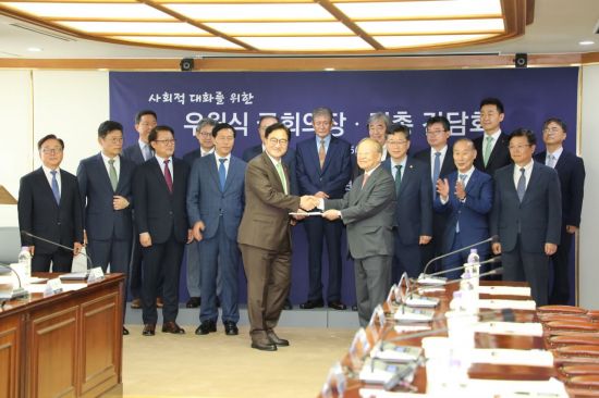 손경식 한국경영자총협회 회장과 박승희 삼성전자 사장 등 회장단 13명이 우원식 국회의장을 만나 법인세를 낮추고 노동조합법 개정안을 막아달라고 요청했다.