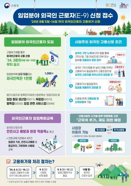산림청은 내달 5일~16일 임업 분야 외국인 근로자 고용허가(E-9) 신청·접수가 진행된다고 30일 밝혔다.