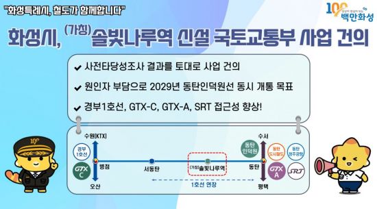 정명근 화성시장은 "솔빛나루역 신설을 바라는 시민들의 염원이 큰 만큼 국토부, 국가철도공단과 적극적으로 협의할 것"이라며 "신설 역사가 2029년 동탄~인덕원선과 동시에 개통될 수 있도록 최선을 다하겠다"고 말했다.