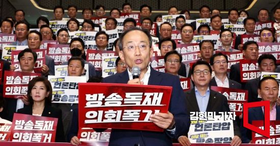 (서울=연합뉴스) 김주성 기자 = 국민의힘 의원들이 본회의를 앞둔 1일 오후 국회 로텐더홀에서 야당의 이진숙 방송통신위원장 탄핵소추안 발의와 '노란봉투법' 본회의 상정 등을 규탄하고 있다. 2024.8.1
