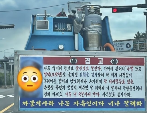 도로를 주행하던 운전자가 다소 황당한 경고 문구를 목격했다는 사연이 전해졌다.