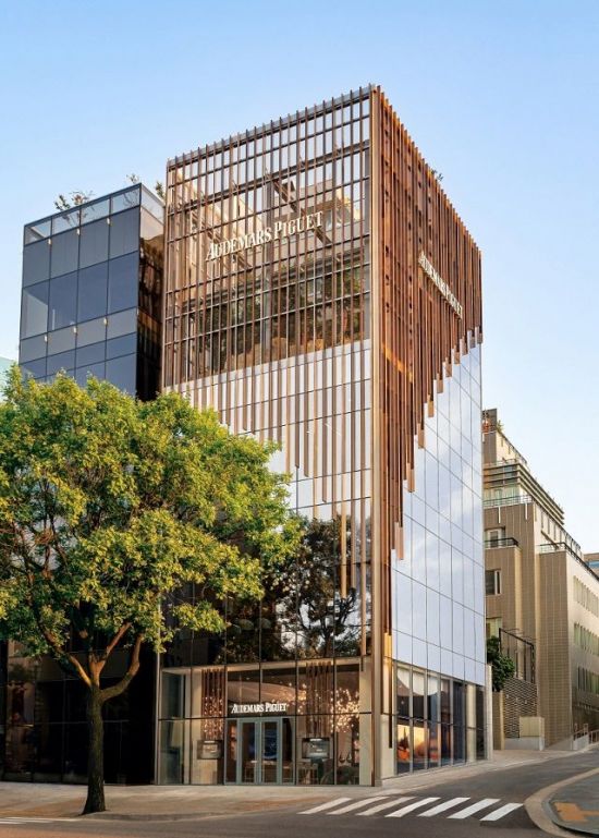 940 m²의 면적의 이 복합 건물은 부티크, AP 하우스 및 고객 서비스 센터를 포함하는 6개의 층에 걸쳐 있다. 또한 멀리 남산 정상에 위치한 서울의 대표적인 상징물인 N 서울 타워(N Seoul Tower)뿐만 아니라 명품 패션 거리의 활기찬 전망을 감상할 수 있는 옥상 테라스를 포함하고 있다. 떨어지는 빗방울을 연상케 하는 건물 외관의 브론즈 색상의 멀리언(mullion) 구조물은 오데마 피게의 본고장인 스위스 발레 드 주의 자연 경관에서 영감을 얻었다. 오데마 피게의 스위스 유산과 한국의 문화 및 서울의 생동감 넘치는 리듬을 엮어낸 실내 장식은 브랜드의 오랜 파트너인 코스타 스타타키스(Kosta Stathakis)가 이끄는 스위스 기반의 블렌드 스튜디오(Blndd. Studio)와의 협업으로 디자인되었다.
