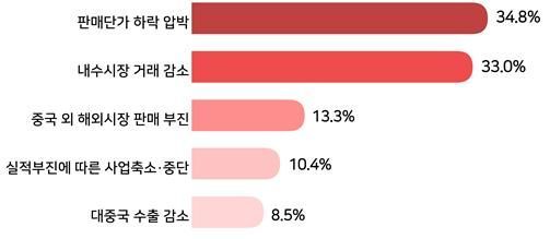 기업들은 주로 '판매단가 하락 압박(34.8%), '내수시장 거래 감소(33.0%)', '중국 외 해외시장 판매 부진(13.3%)', '실적 부진에 따른 사업 축소·중단(10.4%)', '대중국 수출 감소(8.5%) 등의 피해를 겪고 있거나 예상하는 것으로 나타났다.