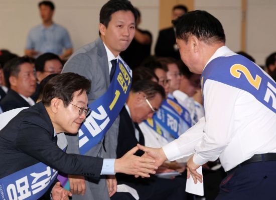 지난 4일 오전 광주 서구 김대중컨벤션센터에서 열린 더불어민주당 대표·최고위원 후보자 합동연설회에서 이재명 후보가 발표를 마치고 자리로 돌아오는 김두관 후보와 악수하고 있다. [이미지출처=연합뉴스]