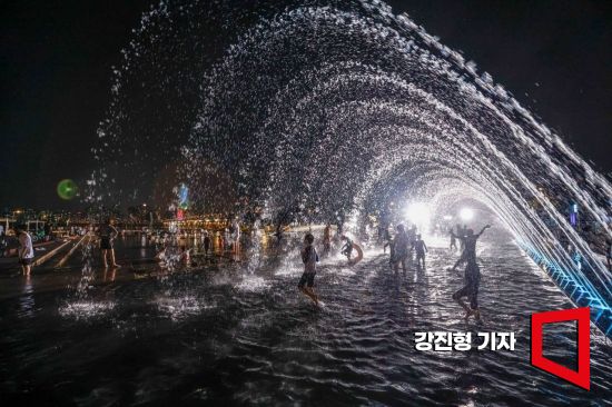 열대야가 26일째 이어지고 있는 15일 서울 여의도 한강공원을 찾은 시민들이 물놀이를하며 더위를 식히고 있다. 서울의 열대야는 지난달 21일부터 이날까지 26일째 이어지면서 2018년과 같이 역대 가장 긴 열대야를 기록했다.