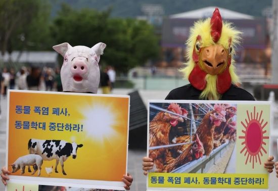 27일 서울 광화문 광장 이순신동상앞에서 한국동물보호연합 회원들이 동물 폭염 폐사, 동물학대 고발 기자회견 피켓팅 후 동물탈을 쓰고 퍼포먼스를 하고 있다. 사진=조용준 기자 jun21@