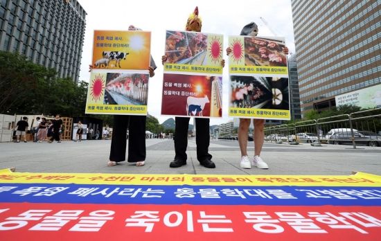 27일 서울 광화문 광장 이순신동상앞에서 한국동물보호연합 회원들이 동물 폭염 폐사, 동물학대 고발 기자회견 피켓팅 후 동물탈을 쓰고 퍼포먼스를 하고 있다. 사진=조용준 기자 jun21@