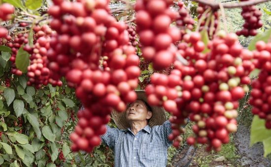경남 함양군 백전면 백운리 해발 600m 노지 오미자밭에서 박영준 씨가 빨갛게 잘 익은 새콤달콤한 오미자를 수확하고 있다.