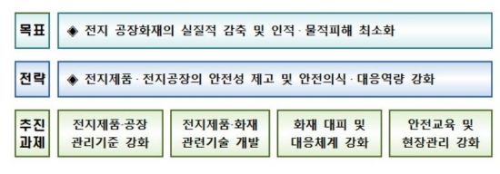 전지공장에 대해서도 소방 관계법령 적용 대상과 기준을 개선해 위험물질 공정안전관리를 강화한다. 전지공장에 대한 화재안전영향평가를 실시해 화재 원인을 분석하고, 위험성을 완화할 수 있는 개선과제를 발굴한다.