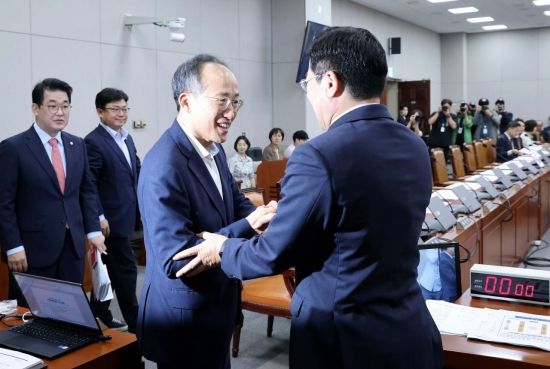 박찬대 국회 운영위원장과 추경호 국민의힘 원내대표가 25일 국회에서 열린 운영위원회 전체회의에서 만나 인사하고 있다. 사진=김현민 기자 kimhyun81@