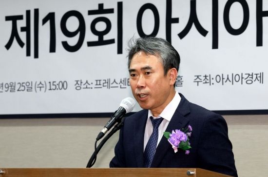 유창수 서울시 행정2부시장이 25일 서울 중구 프레스센터에서 열린 제19회 아시아건설종합대상 시상식에서 축사하고 있다. 사진=김현민 기자 kimhyun81@