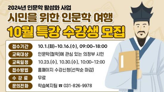 재단법인 의정부시평생학습원(원장 유상진)은 오는 23일과 30일 의정부문화역 이음에서 ‘2024년 시민을 위한 인문학 여행, 10월 철학 강좌’를 운영한다고 4일 밝혔다.