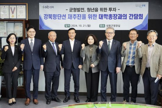 성북구와 성북구 관내 6개 대학이 21일 간담회를 갖고 강북횡단선 신속 재추진에 대학이 뜻을 모으고 범 구민 서명운동에 동참한다고 밝혔다. 좌측부터 박현숙 고려대 학생처장, 구자억 서경대 혁신부총장, 김형진 국민대 부총장, 이승로 성북구청장, 김명애 동덕여대 총장, 이창원 한성대 총장, 이성근 성신여대 총장, 최경주 성북구부구청장. 성북구 제공.